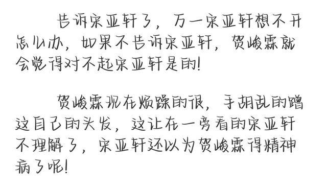 贺峻霖抬头看着宋亚轩,他决定了,不告诉宋亚轩呢件事,他觉得还是刘耀文亲自告诉他的比较好,万一自己告诉宋亚轩了,宋亚轩去找刘耀文问,刘耀文在说出什么刺激的话,就宋亚轩这承受能力,万一想不开自杀了怎么办,贺峻霖摇了摇了头,冲散自己的想法!