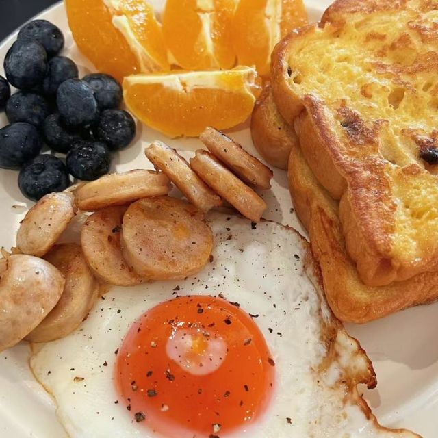 藤唐静荷包蛋分别放在装烤肠的盘子