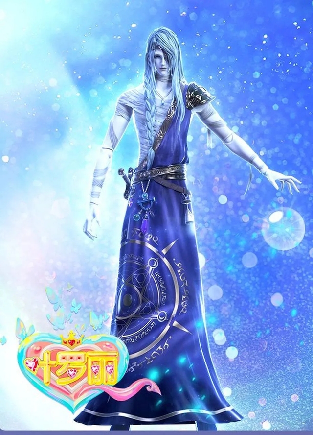灰蓝色的长发,精致柔和的五官,斜刘海与皮质抹额遮盖了他的左眼,只剩右边海蓝色的眼眸犹如宝石一般透亮,长眉入鬓,美如谪仙。手上缠着白色绷带,身着蓝紫色古希腊长袍,上面金色的法阵图纹显得他神秘非常。