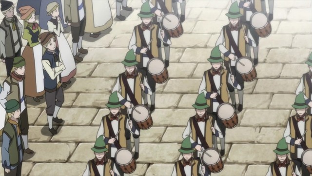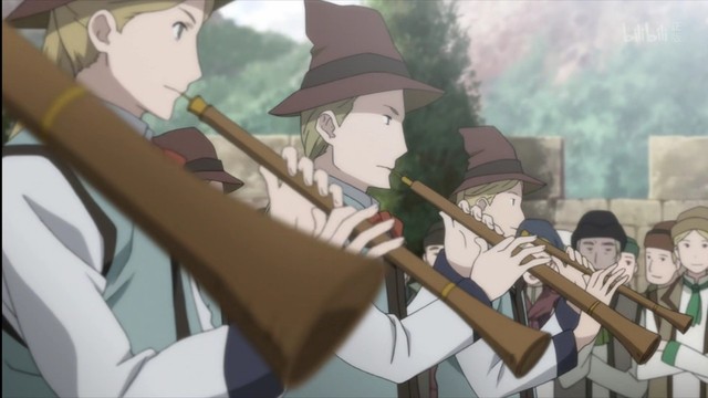 村里的小姑娘终于把篮子的榛果丢完,笑着退开。接着换成年轻男子分为穿着褐衣骑马的冬之军和穿着蓝衣持长枪的夏之军开始跳起模仿战争的舞蹈。
